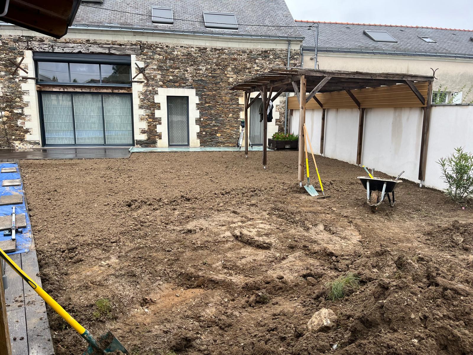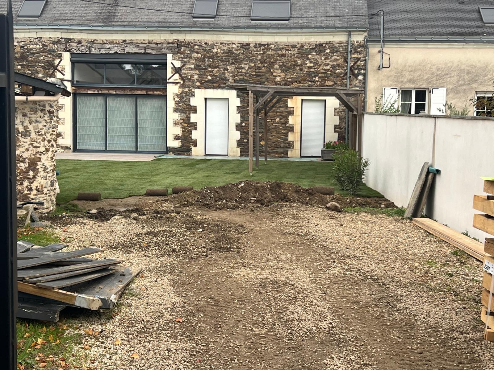 Saint-Melaine-sur-Aubance, qui a nécessité un changement complet du gazon et des palissades. À la demande de nos clients, nous avons d’abord procédé à un décaissage en utilisant une mini-pelle, permettant d’éliminer l’ancienne terre qui avait perdu de sa qualité. Cette terre a été évacuée et recyclée de manière responsable.